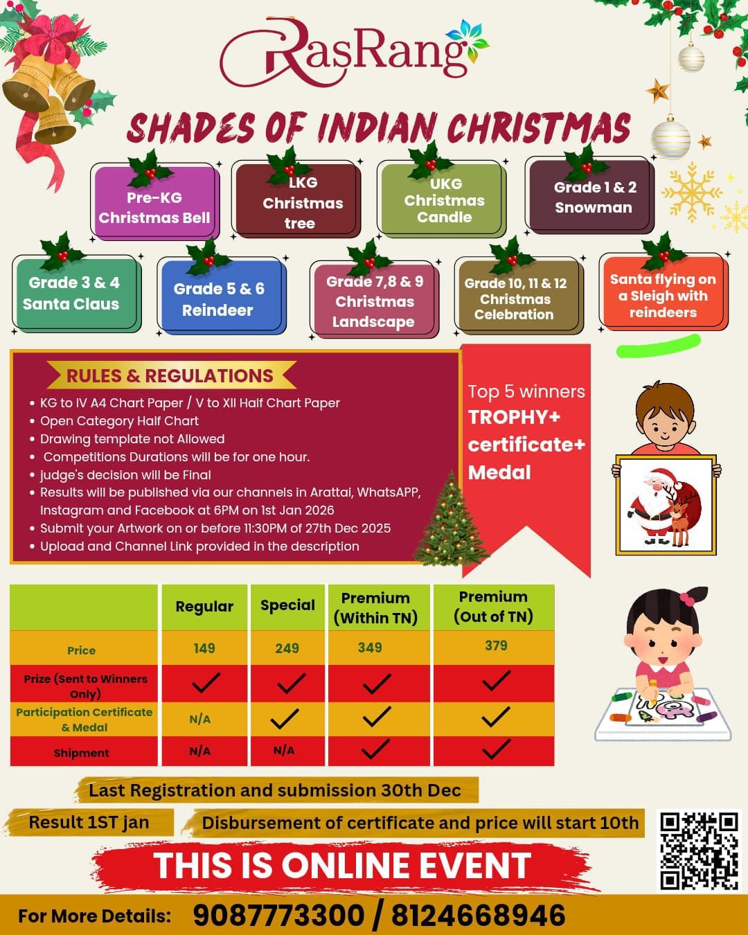 An exciting Online Drawing Competition for kids from Pre-KG to Grade 12 and open category, celebrating the joy and creativity of an Indian Christmas! 🇮🇳❤️💚